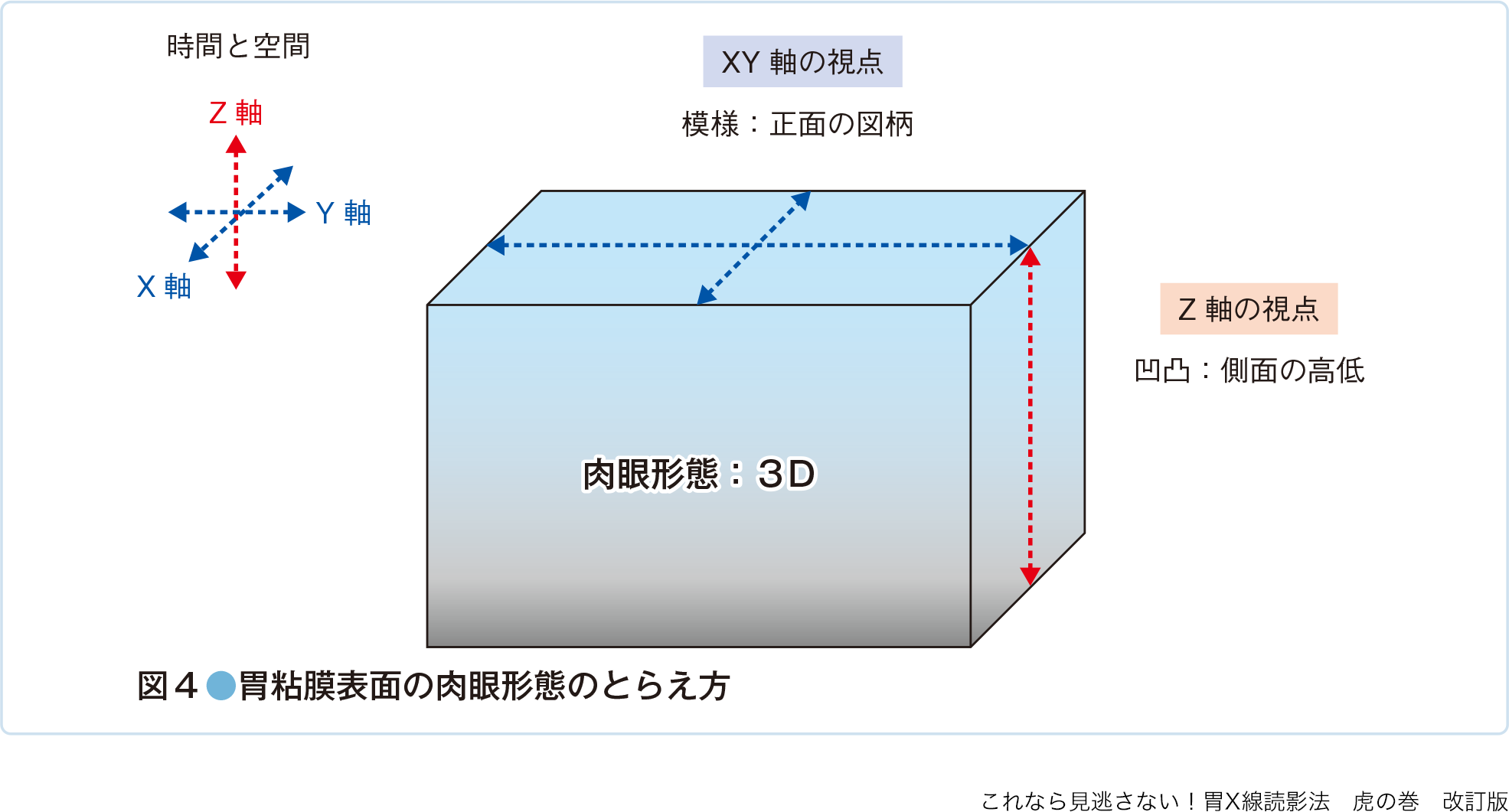 実体の胃粘膜表面の肉眼形態を胃X線撮影や読影において総合的に表現するためには,空間的なXY軸の模様とZ軸の凹凸を基本としてとらえる必要があります.