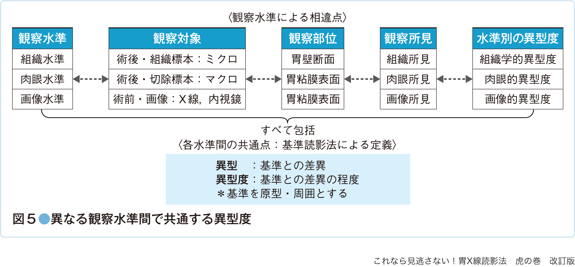 また,対象の観察水準間における相違点を示します(図5).観察水準によって観察対象や観察部位,観察所見などがそれぞれ異なっていますが,異なる観察水準間で共通している点がいずれも視覚上の形態的な異型度を判断しているということです.