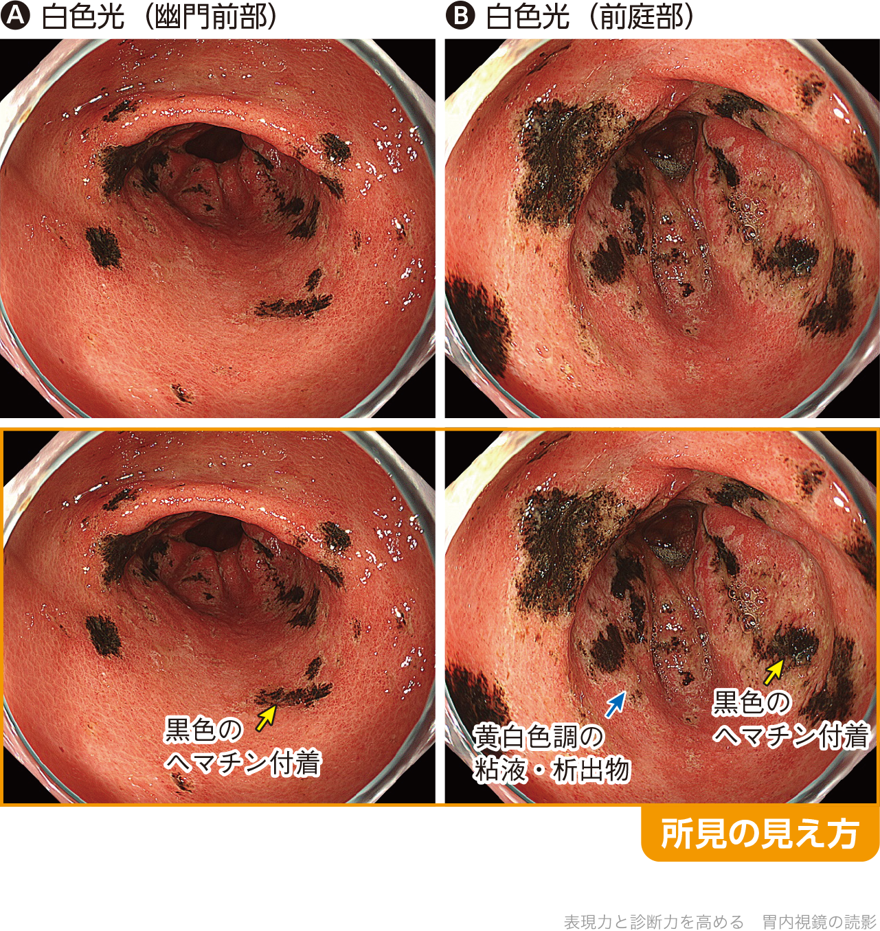 本例は胃前庭部~幽門前部に,全体に光沢がありヘマチン付着を伴ったびらんを認めていました.送気での変形も認め,その形状も特徴的なことから診断はさほど苦にはなりませんでした.