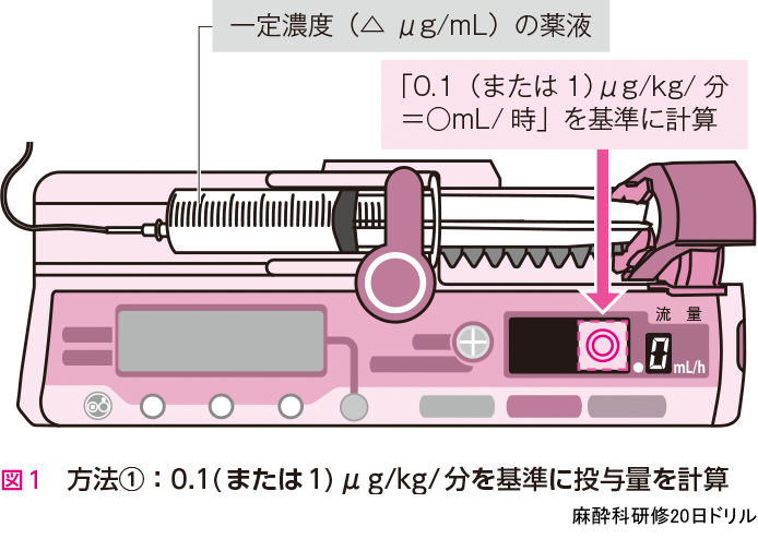 - シリンジポンプは,通常1時間あたり◯mL投与(◯mL/時間)にセットするため,◯mL/時間→ ⬚μg/kg/分という変換が必要になる.これには,以下の2種類の方法がある