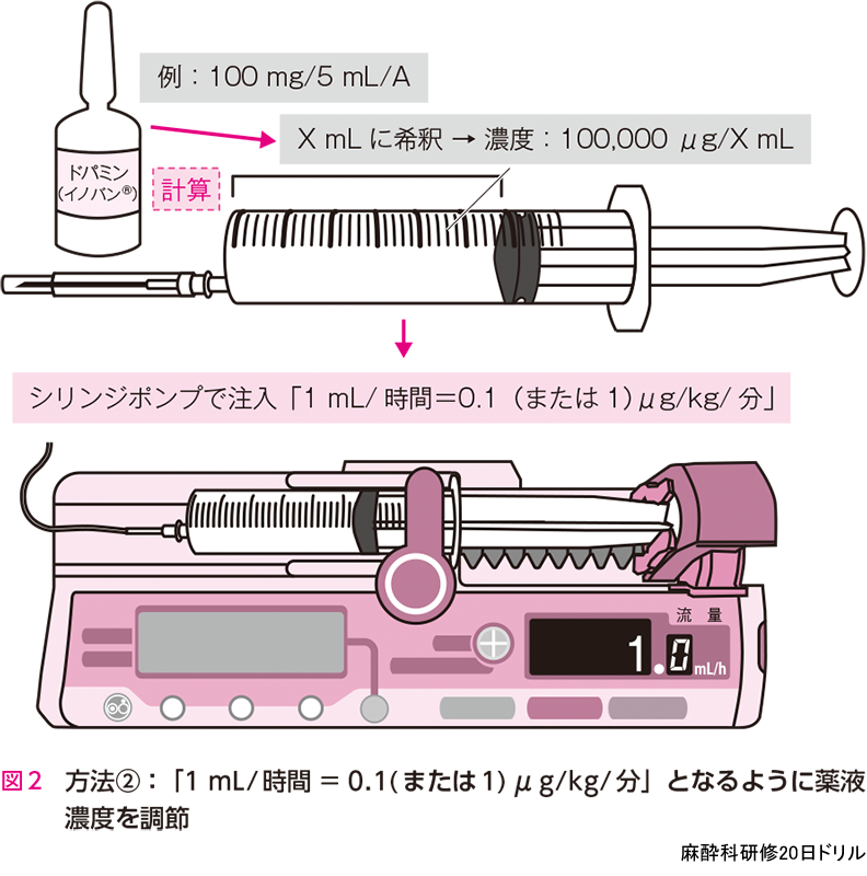- 重要な昇圧薬であるドパミン(イノバン®など)は,製剤により濃度はさまざまだが,3~10(ときに1〜20)μg/kg/分で使用する.方法① (図1),方法②(図2),どちらも使用する.