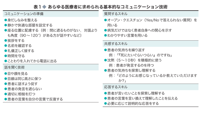 がん医療にかかわらず,患者―医師間のコミュニケーションにおいて重要なことは基本的なコミュニケーション技術である(表1).これらは,医療者としてというよりも,1人の人間として,他者とのコミュニケーションにおいて求められるものである.
