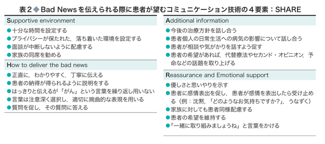 このような基本的コミュニケーションを踏まえ,Bad Newsを伝え,予後を話し合う際には,患者の意向に沿ったコミュニケーションの重要性が指摘されている.わが国のがん患者がBad Newsを伝えられる際に医師に対して望むコミュニケーションは,「Supportive environment(支持的な環境の設定)」,「How to deliver the bad news(Bad Newsの伝え方)」,「Additional information(付加的な情報の提供)」,「Reassurance and Emotional support(安心感と情緒的サポートの提供)」という4つの要素であり,その頭文字からSHAREとしてまとめられている(表2).