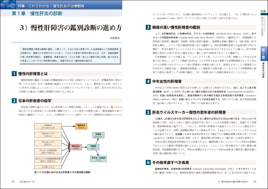 慢性肝炎の治療とマネジメントがよくわかる!肝硬変や肝癌を防ぐための外来フォロー,栄養管理についても,根拠や処方例を示して具体的に解説.豊富な図表で重要ポイントがわかりやすく,全ての臨床医におすすめ!