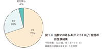 診療ガイドラインに沿って考えたときに,無症候性キャリアと判断されたものは,3~6カ月ごとのフォローアップを受けることになるが,このフォローアップが途切れないように配慮をすべきである.C 型肝炎については,肝機能が正常(ALT < 30 IU/L,血小板数 15 万以上)の患者でも,経過フォロー中にALT の上昇をみるものがほとんどであり,また,病態としても炎症が持続していることが多い.図1は当院で肝生検を施行したPNALT(persistent normal ALT)症例の生検結果の内訳であるが,90 %以上の患者については肝組織上,何らかの変化が現れており,これを裏付けている.抗ウイルス療法や肝庇護療法を継続している患者の場合,通院継続は至極当然であるが,キャリアとしてフォローする場合も途切れず受診を続けるように指導する.