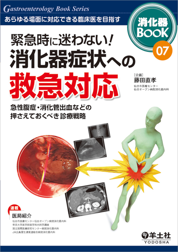 - 【本書名】消化器BooK:緊急時に迷わない!消化器症状への救急対応〜急性腹症・消化管出血などの押さえておくべき診療戦略