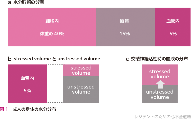 成人では身体の約60%が水分でできています.また,身体の中の水分は細胞内・細胞外にそれぞれ分布し,細胞外の水分は,間質・血管内というパートにそれぞれ分布します(図1a).血管内の水分はさらに,全身への循環に関与するstressed volume(血管内の20〜30%)と,関与しないunstressed volume(血管内の70〜80%)に分けられます(図1b).なぜこのように細かく分布が分かれているのでしょうか? それは,生体がさらされるダイナミックな環境変化に,すみやかに対応するためです.
