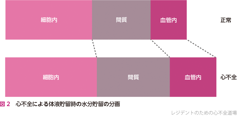 心不全の非代償期はどのようにして起こるのでしょうか.一つは細胞外液全体が一様に増加することにより,結果としてstressed volumeも増加しうっ血を起こすという機序です(図2).この場合は身体全体が水分貯留傾向となっており,短期間での体重増加を伴うことが多いです.そのため,心不全患者は日々の体重管理を行うことで,増悪の機微がとらえやすくなります.また,間質にも一様に水分量が増えており,身体所見としては浮腫などが,検査の所見としては胸水・腹水貯留がみられます.血管内volumeの増加もみられ,身体所見では頸静脈怒張が,心臓超音波検査では下大静脈の拡張・呼吸性変動の消失がみられます.このようなケースでは,貯留した体液量を減らす必要があるため,利尿薬が第一選択になります.