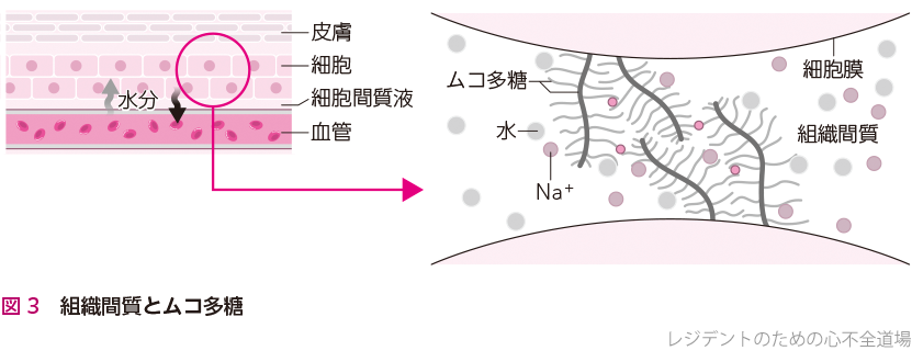 浮腫とは皮下の組織間質に水分が過剰に貯留した状態を指します.さまざまな原因で浮腫が出現しますが,心不全における浮腫は主に体液過剰とそれに伴う静水圧の上昇により起こります.組織間質にはムコ多糖という物質が豊富に存在します(図3).ムコ多糖はマイナスに帯電しており,多くのNa+を結合できる能力を有し,Na+のリザーバーの役割も果たしています.体内のNa+量が過剰になると組織間質に貯蔵されていきます.それと同時に組織間質内の浸透圧が上昇するため,水分が間質に移動します.この間質内に過剰となった水分が,浮腫として表現されます.実際,1 gの塩分を摂取すると,体液量が200~300 mL増加するといわれており,心不全患者においては1日6 gを超える塩分摂取は避けるように推奨されています2).