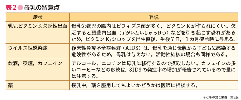 成乳は,乳清たんぱく質が高く,カゼイン★5の割合が少ないため消化しやすく,アミノ酸組成は乳児の発育に適している。脂質はリノール酸,リノレン酸が多く,消化しやすい。糖質の多くはラクトースであり,カルシウムの吸収を促進する。オリゴ糖が含まれており,ビフィズス菌を増殖し,感染から身を守る。ミネラルは少なく腎臓に負担をかけず,吸収率は高い。ビタミンはほとんど含まれている。乳児に適した消化・吸収しやすい栄養成分を含むので,完全栄養といえる。母乳育児の利点と留意点は表1,表2にまとめた。