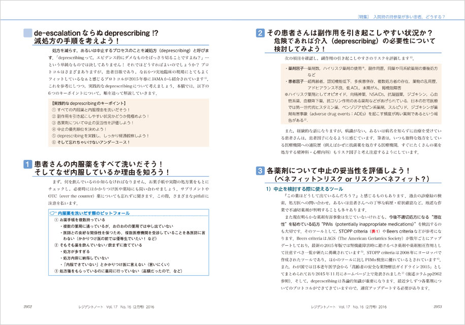 今回は「ポリファーマシー」の特集です.まだまだ日本では十分浸透しているとは言えないこの概念について,新進気鋭の若手総合診療医を中心に健筆を振るってもらいました.この言葉を聞いたことがある人もない人も,本特集を通じてその概念・問題点・具体的な介入方法などを学んでいただければ嬉しいです.「薬が多いのはいかん!」とか「薬をドンドンやめればいいんだ!」といった短絡的なメッセージが伝わるのも問題ですが,盲目的に「薬を飲んでいれば大丈夫」と思っている患者さん,「薬は多いとは思うけど,しかたないよね」と思っているような医療者がポリファーマシーについて考える機会になればと思います.これから臨床の現場で活躍していく若手の先生方がこの概念を知って,処方をするときに意識したり,情報提供したりしていくことが,これからの日本のポリファーマシーを変えていく1つの方法だと思っています.皆さんにとって,今回の特集が何かしらのきっかけになることを願っています.