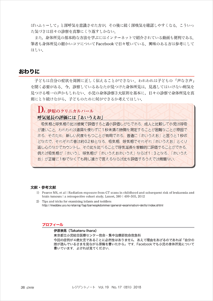 - 【本書名】レジデントノート増刊:小児救急の基本 「子どもは苦手」を克服しよう!〜熱が下がらない、頭をぶつけた、泣き止まない、保護者への説明どうする?など、あらゆる「困った」の答えがみつかる!