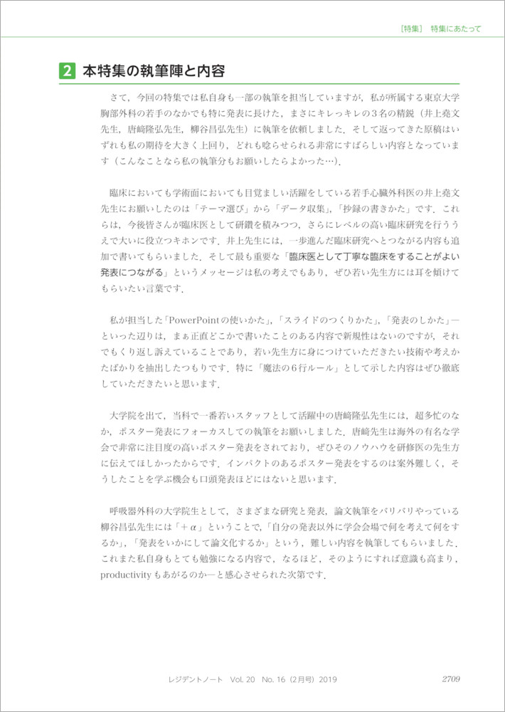 私自身は医師免許を手にして20年になろうとしています.この間に学会などで数多くの発表の機会をいただき,またほかの人の発表を聴いたり,同僚や後輩の発表を手伝ったり指導をする機会をいただきました.そのなかで,私が今となってはあたり前と思うことも,発表の初心者にとっては必ずしもそうではない,ということにハッとすることが多いです.