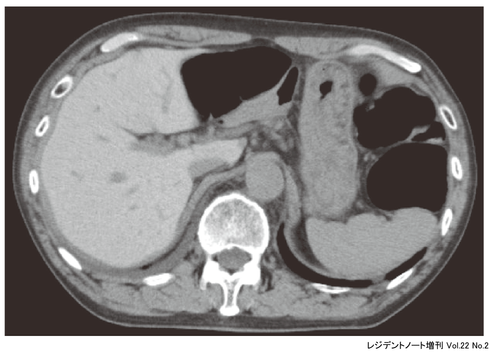 この症例では,ICDの植込み歴があり,アミオダロン肝と診断された.塩酸アミオダロンは抗不整脈薬の1つで,脂溶性のため,脂肪組織や肺,膵臓,肝臓,心臓,腎臓に蓄積されることが知られている.ヨードを含有しているため,肝臓に蓄積すると肝実質が高吸収を示す.