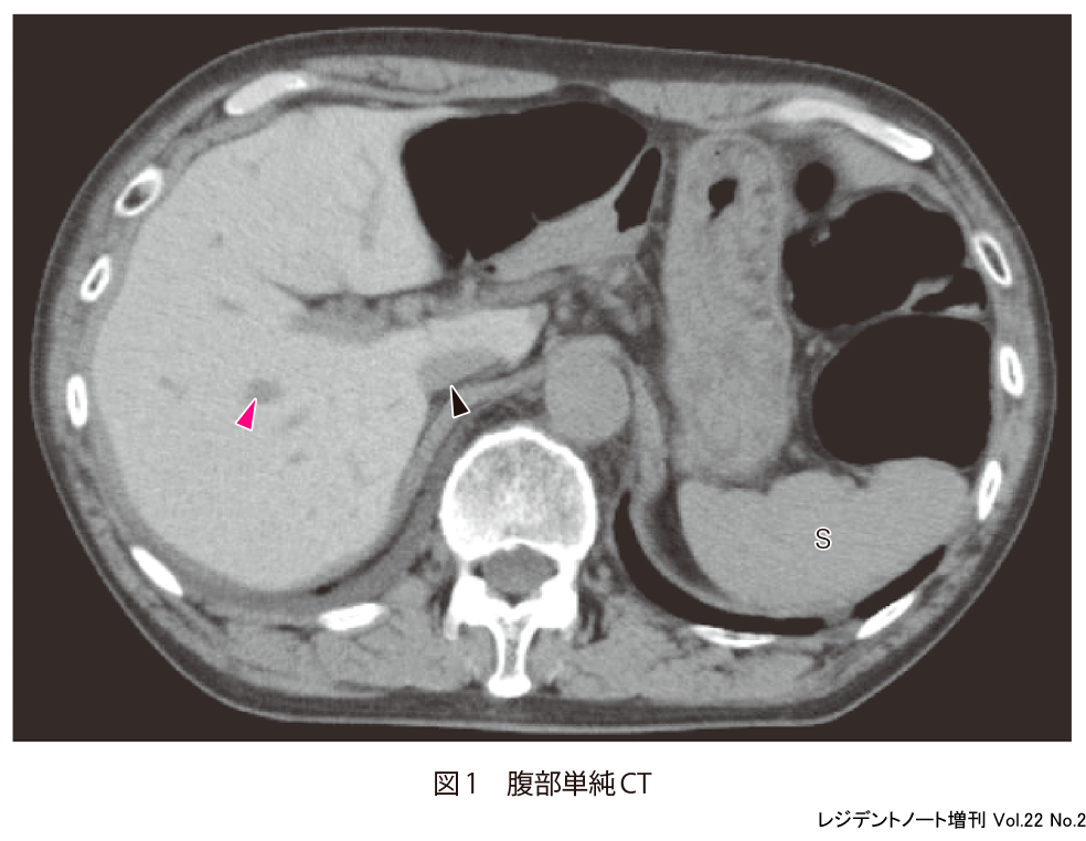 単純CTで肝実質がびまん性に高吸収に描出されている.肝実質と門脈(図1▶︎),IVC(inferior vena cava:下大静脈,図1︎▶)とのコントラストが増強しており,脾臓(図1︎ S)と比較しても肝実質が高吸収になっていることがわかる.びまん性に濃度変化を生じていると,一目では変化に気がつかないことがある.比較画像がある場合はその画像との対比を,比較画像がない場合には周囲にある構造と濃度を比較することで,変化や異常に気がつきやすくなる.今回の場合では,肝実質と肝内血管の濃度差,肝実質と脾臓の濃度差に気がつけるかどうかが最大のポイントとなる.