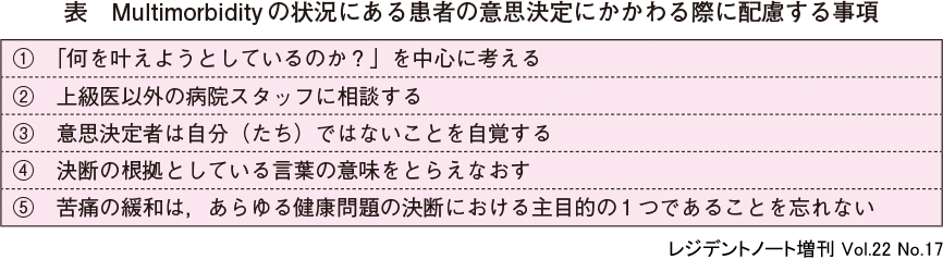 Multimorbidity診療においては,患者自身が決断の主体となって意思決定を運んでいくことが簡単ではないことが多い.そのような状況下で,医療者はとても重要な意思決定の関与者ではあるが,意思決定者そのものではない.意思決定の主体は常に患者自身にあり,医療者も患者家族も患者自身の意向を推し量り,患者の意思決定を支える者たちであるという自覚を常にもつべきであろう.その意味では,医療者は意思決定においてあまり家族と話し過ぎない方がよい.患者本人をよそにして医療者と家族同士で話せば話すほど,その意思決定は患者のものから離れていくことに配慮するべきであろう.