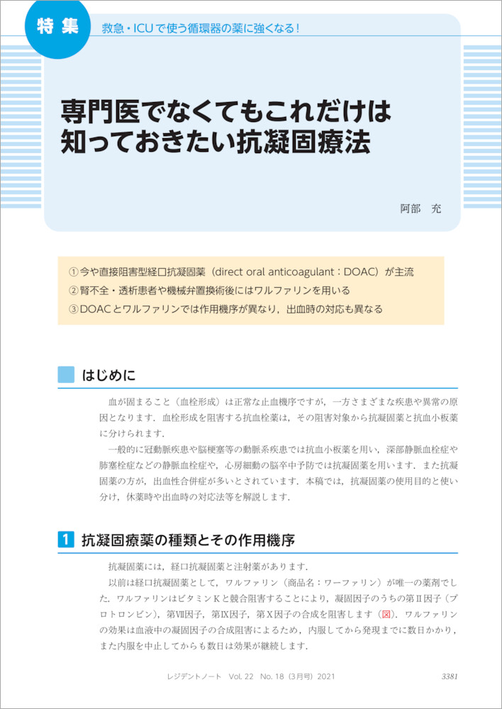 循環器系の薬剤に苦手意識をもつ医師は若手・ベテランにかかわらず多いようです.これは,循環器系の薬剤は患者さんにすぐに投与しなければならないのにもかかわらず,「この病態にはこの薬剤をこれだけ投与」といった決まり切ったレシピがないのが普通で,患者さんの循環動態などにあわせて微調整していく必要があることによるのでは,と思います.さらに循環動態の把握にはゴールドスタンダードとなる評価法が十分に開発されておらず,「モニターのデータがこうであるからこの薬剤をこれくらい使う」といったことがはっきりといえないことも多くの医師が困惑する原因となっているのではないでしょうか.…