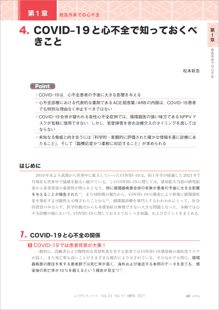 救急外来・ICU/CCU・病棟・退院後の外来など,心不全診療における状況別の考え方・動き方が身につく!新しい治療薬や緩和ケア,COVID-19の対応など「いま知りたい」トピックスも詰まった一冊.
