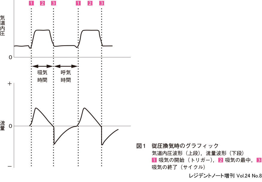 図1は従圧式強制換気(PC-A/C)をしている患者の圧波形(上段)と流量波形(下段)である.このなかに非同調を考えるうえで重要なタイミングが3カ所ある.1 吸気の開始(トリガー),2 吸気の最中,3 吸気の終了(サイクル),である.このそれぞれで非同調が生じうるため,以下に3つのタイミングに分けて解説する1).