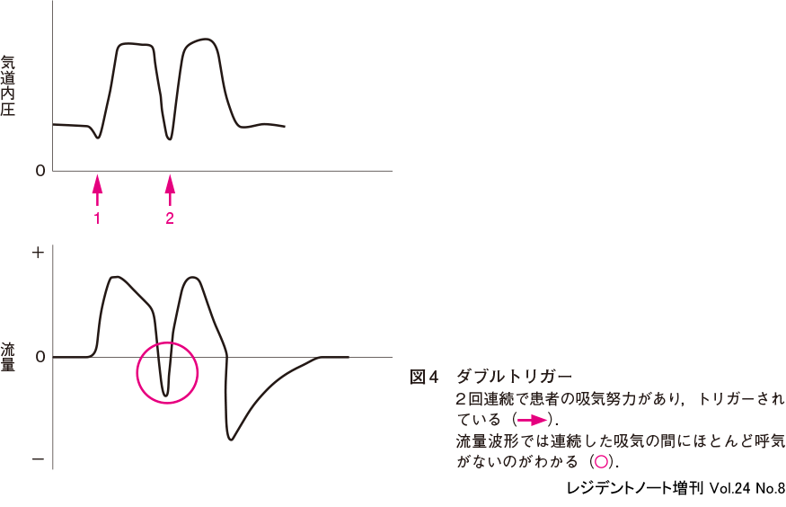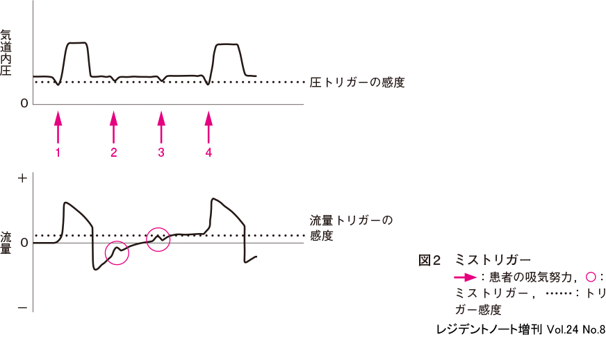 図2はミストリガーが起こっているグラフィックである.この図の中で患者は4回の自発呼吸(吸気努力)をしている(図2 →).ところが人工呼吸器が送気を行っているのは1番目と4番目のみであり,2・3番目の吸気努力は無視してしまっている.このときに患者を観察すると,顎だけ動く,喘ぐような自発呼吸努力がみられるだろう.流量波形を見るとその吸気努力が上向きの波形として現れる(図2 ○).