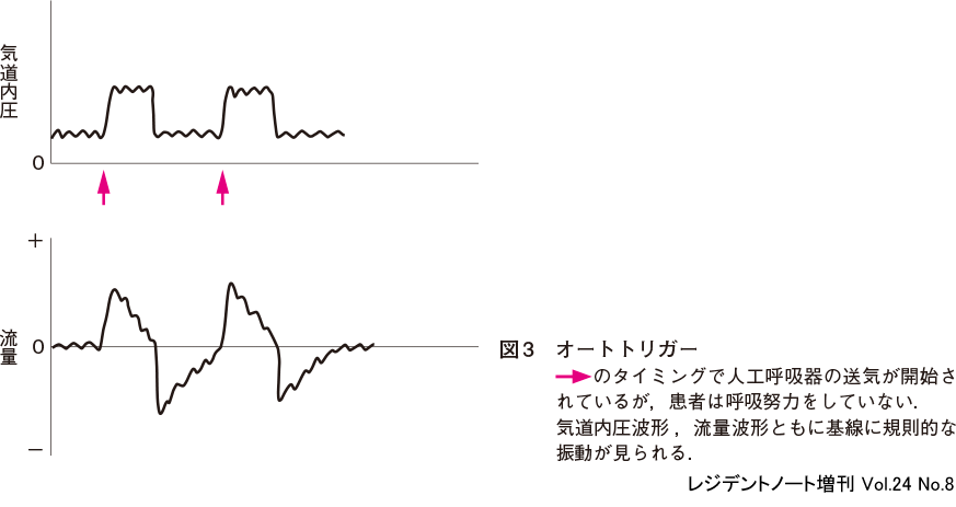 患者を観察すると,胸鎖乳突筋などの呼吸補助筋が全く動いていないのに,人工呼吸器の送気が開始されてしまっているのがわかる.グラフィックを見ると,圧波形も流量波形も基線が細かく振動している(図3).オートトリガーは,このような基線の振動が設定した圧や流量トリガーレベルに達してしまうことによって起こる.例としては,人工呼吸器の回路内に溜まった水が移動して起こることや,振動が心拍数に一致する場合は回路が患者の体幹に接し,患者の心尖拍動や大動脈内バルーンパンピング(intra-aortic balloon pumping:IABP)の振動を拾ってしまっていることがあげられる.このような場合は回路の調整やトリガー感度を鈍くすることを考慮する.