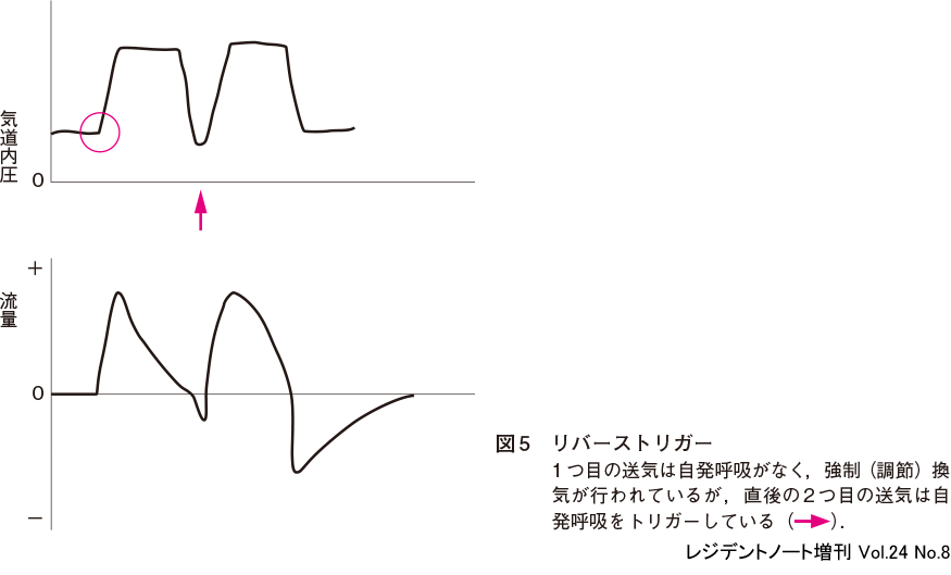 患者の自発呼吸がない状態で強制換気(調節換気)が開始されると,その刺激で患者の横隔膜の収縮が誘発され,トリガーがかかってしまう非同調である.自発呼吸ではじまるのではなく,強制換気ではじまり,それにより自発呼吸が引き起こされるという逆のあべこべな状態になるため,リバーストリガー(reverse triggering)とよばれる9).患者の気持ちは「私,今休んでいるから呼吸しないよ.わ! 急に押されたからびっくりした! 思わず息吸っちゃった!」に対して,人工呼吸器の気持ちは「自発呼吸がないから強制換気で助けてあげよう.よいっしょ(送気),わ! 急に動いた,それならもう一度送気しよう」となる.図5は1つ目の送気は自発呼吸がないため,強制(調節)換気が行われている(図5 ○).その直後に自発呼吸が出現し,次の送気が開始されている(図5 →).一見ダブルトリガーに似ているが,1つ目の送気が自発呼吸をトリガーしていない点で異なる.深めの鎮静レベルにあると起こりやすいと言われている(基本的に眠っていて自発呼吸がないが,刺激で自発呼吸が出るようなイメージ)9).対処法としては患者の全身状態により,鎮静・鎮痛薬を減量し,自発呼吸をしっかり出す方向にするか,完全に自発呼吸を消してしまう方向にするかの2択を考える.
