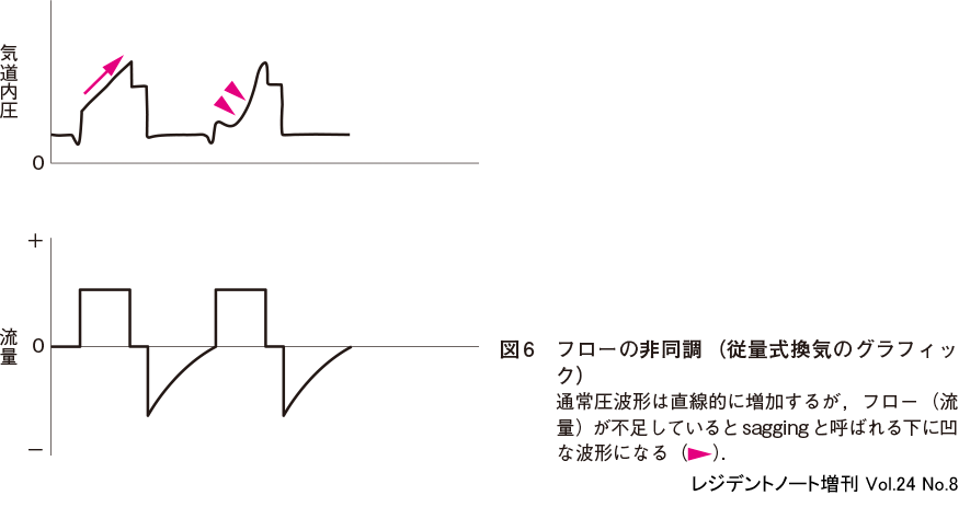タイミングとしては吸気の最中に起こっているのだが,機序としてはフローすなわち単位時間当たりに流れる流量が少な過ぎることにより起こるため,一般的にはフローの非同調とよばれる.ダブルトリガーと同じく「足りない系」の非同調である.フローの飢餓という意味でflow starvationともよばれる.患者の気持ちは「私もっと吸いたい,全然足りないよ! もっとちょうだい!」に対して,人工呼吸器の気持ちは「足りないからと言って2回連続で吸うなよ!」となる.従圧式換気(PCV)では患者の要求(吸気努力)に応じてフローが増減するので,主に従量式換気(VCV)で起こる10).図6はVCVの波形である.通常の圧波形は→のように直線的に上昇するが,フローが足りない場合は,2つ目の波形のように凹んだ形になる(図6 ▶).垂れ下がったような形になるので,saggingともよばれる.対処法としては,VCVのままであれば1回換気量を増やす,もしくはPCVに変更することを検討する.