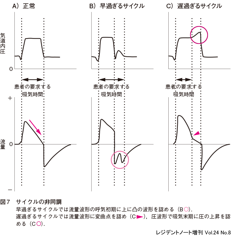人工呼吸器で設定した吸気時間が,患者の要求する吸気時間よりも短か過ぎる場合に起こる非同調である11).early cycling(premature cycling)とよばれる.患者の気持ちは「私もっと吸いたい,全然時間が足りないよ! もっと長くちょうだい!」に対して,人工呼吸器の気持ちは「え? そんなに欲しかったの,短く吸気時間が設定されていたから,早めに呼気に切り替えちゃったよ」となる.ダブルトリガーやフローの非同調と同じく「足りない系」の非同調と言える.図7Bは早過ぎるサイクル(短か過ぎる人工呼吸器の設定した吸気時間)のグラフィック波形である.呼気の初期に上に凸の流量波形がみられるのが特徴である(図7B ○).人工呼吸器で設定した吸気時間は終わっているが,このタイミングまで患者の吸気努力(患者の要求する吸気時間)が続いている現れである(図7B ↔).足りない系の非同調であるため,人工呼吸器で設定する吸気時間を延ばすか,吸気圧・サポート圧(もしくは1回換気量)を増やすことで対応する.
