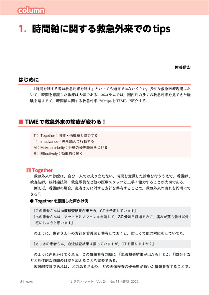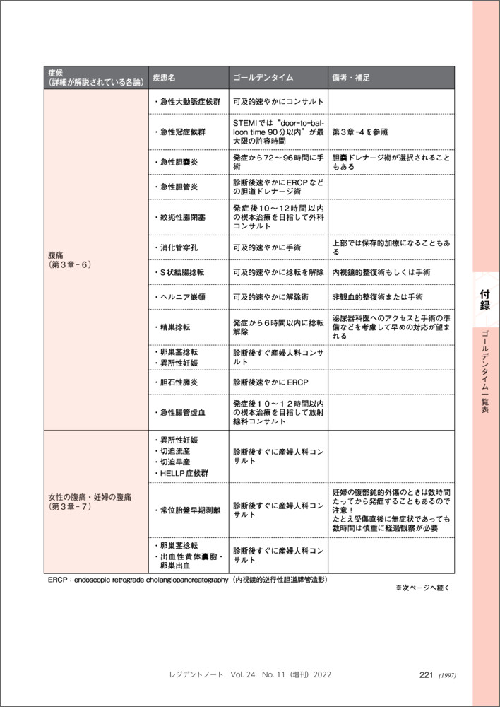 救急外来での初期評価・対応において,診断・治療・専門医へのコンサルテーションをいつまでに行い,それらを急ぐ状況について解説.救急診療で時間軸を意識すれば,素早く優先順位を判断し,現場で適切に動ける!