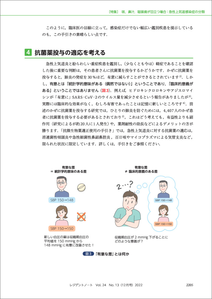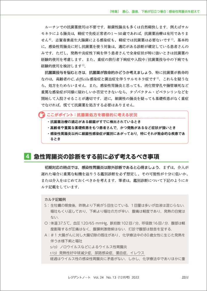 いまでこそ大学病院で指導医として研修医や医学生を教える側にいますが,私にも研修医時代がありました.このころ,救急外来で数百人の患者さんを診察してカルテに記載した(暫定)診断名で最も多かったのは,急性上気道炎と急性腸炎でした.深夜に何人も続いた急性腸炎の後にほぼ同じ症状で来た患者さんが虫垂炎であった,「かぜ」と判断して帰宅させた患者さんが髄膜炎として救急外来に戻ってきてしまった,というような苦い記憶もたくさんあります.…