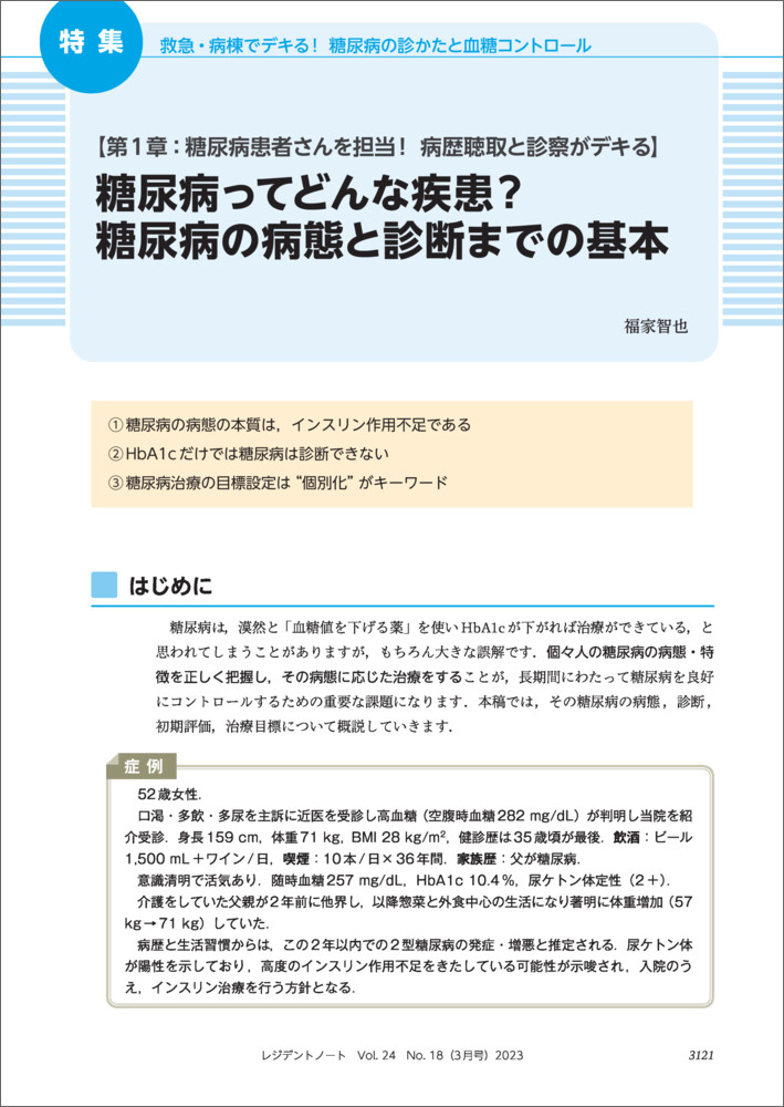 高血糖緊急症にどう対応する?周術期の血糖管理は?教育入院って?最新のデバイスとは?など,研修医がいま知りたい糖尿病診療の知識をやさしく解説.患者さんの抱える想いや暮らしも考えた診療の進め方が学べます.