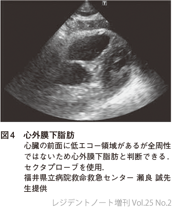 - 心窩部像で心嚢液の存在を指摘できる