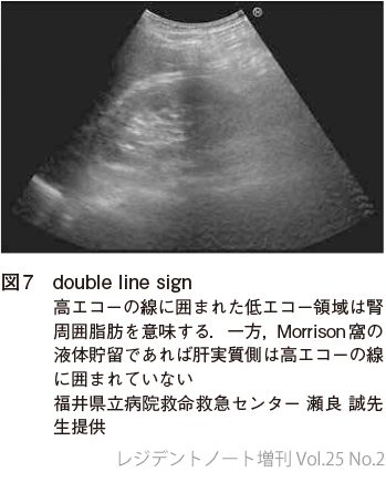 肝周囲,右胸腔に液体貯留があるかどうか確認する.Morrison窩だけでなく肝辺縁までプローブを動かし確認することが重要である(図6).