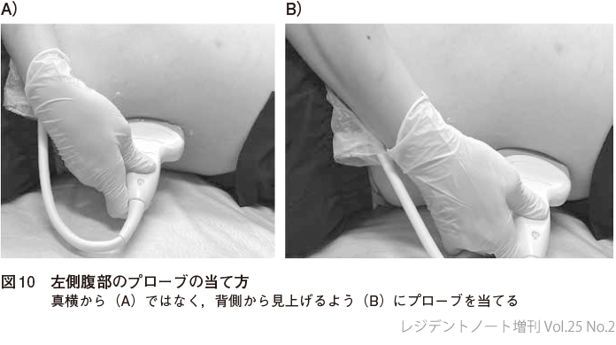 左腎臓は右腎臓に比べ頭側および背側に位置しているため,脾周囲および左胸腔を観察する場合はやや背側から見上げるようにプローブを当てるのがよい.