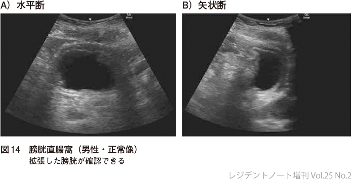 膀胱,前立腺,直腸(通常は壁しかみえない)を同定し膀胱直腸窩に液体貯留があるかどうか確認する(図14,15).