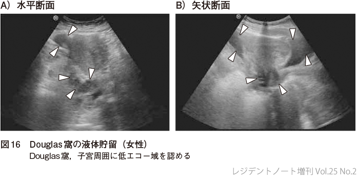 膀胱,子宮,直腸を同定し,直腸子宮窩に液体貯留があるかどうか確認する(図16).