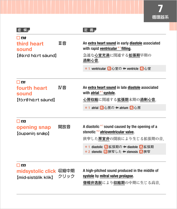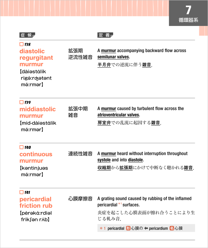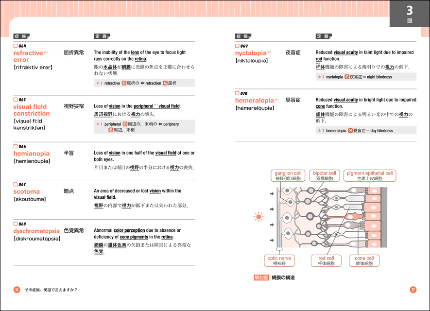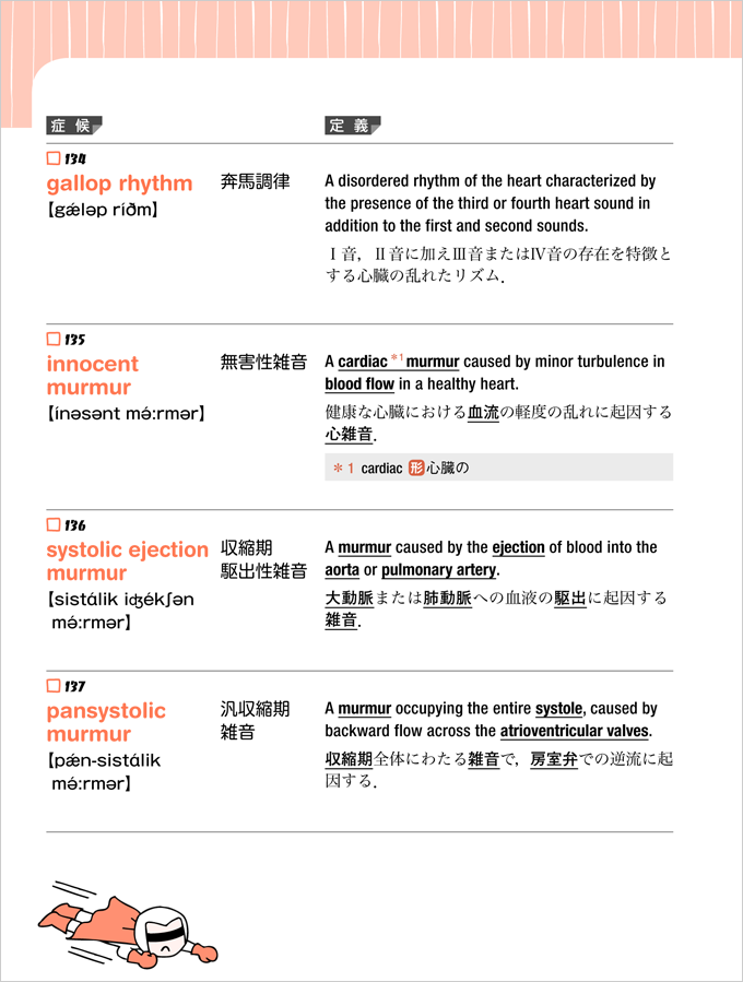 各単語の定義と言いつつ,単語の説明を英語で書いてあるのが,実は秀逸なんだ.英英辞典こそ,単語力を深める必殺技だと,中国4千年の歴史は語っている(嘘).そこで「なんでやねん」と突っ込んでいるあなたは正しい.医学英単語を忘れたとしても平易な英語で説明することができるようになれば,英語の実力が上がること間違いなし.