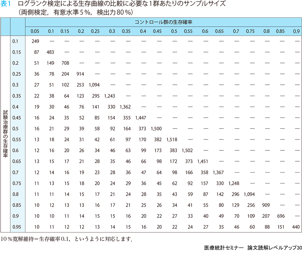 表1は,生存時間データをログランク検定で2群比較するときのサンプルサイズの計算結果を示したものです.表1と表2の数字は,有意水準を両側5%,検出力をそれぞれ80%と90%に固定して,検出したい治療効果(試験治療群とコントロール群の生存確率)を動かしたときの,1群あたりに必要なサンプルサイズです.
