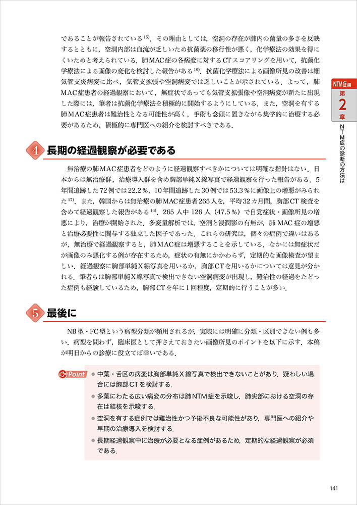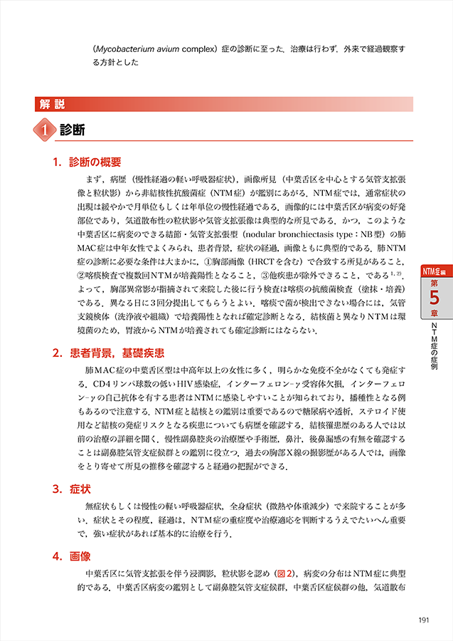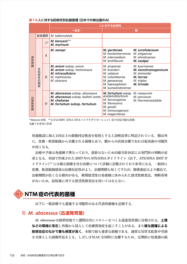 その視点で考えると,結核菌という菌は,ヒトの体内環境に定着増殖するために最大限,進化・適応した抗酸菌であり,非結核性抗酸菌はまだそこまでの能力を備えていない抗酸菌と言うことができる.空気感染の形で容易にヒト-ヒト感染する結核菌は,届け出や入院・隔離,その他法的・社会的に他と区別して対処すべき疾患のため,一般臨床医はときに困惑し,敷居の高い疾患という印象をいだきがちである.一方,非結核性抗酸菌はヒト-ヒト感染は起こさないうえ,ヒトの体内環境で効率よく増殖するという能力は低いため,その病像や経過はさまざまであり,診断と治療の面でわれわれを大いに悩ます疾患であると同時に,やはり敷居の高い疾患と感ずることが多い.一般臨床医から見れば,いずれも何となくとっつきにくい疾患であるが,しかし,今ようやく,そういった悩みや戸惑いに大きく応えて解決してくれる一書が実現した.結核や非結核性抗酸菌症の臨床経験が豊富な佐々木結花先生が,特定非営利活動法人 非結核性抗酸菌症研究コンソーシアム(NTM-JRC,理事長:倉島篤行先生)の全面的な支援を受けてまとめた本書は,わかりやすく知識を得ることのできる一冊であり,困惑・苦労してきた臨床現場の方々にご一読いただきたいうれしい一冊である.