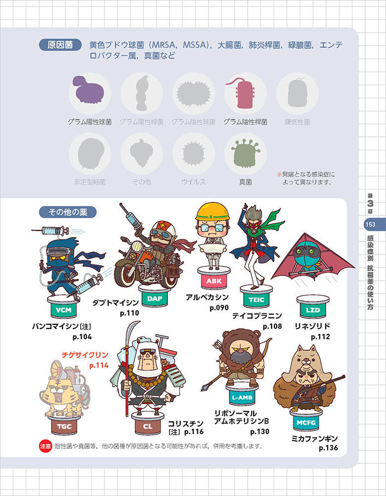 52の抗菌薬をすべてキャラクター化!系統ごとに住む世界・職業をキャラ設定しているため、抗菌薬の特徴や使い方を直感的に記憶できます。抗菌薬に苦手意識をもつすべての医療従事者におすすめです!