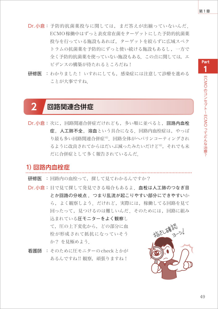 本書は,会話調になっているので,いわば一問一答形式ですぐに必要な情報にありつけます.しかも…この質問をしているのが研修医や看護師さんの設定ですが,救急医の私も聞きたい内容がちりばめられているところに感動です.著者の小倉先生や青景先生は実際に多くのECMO症例を経験し,かつ数々の疑問を解決してきたからこそ,読者が聞きたい質問とその答えにまでたどり着いているのだと思いました.さらに…きちんと引用文献までつけてくれているので,自分で興味があるところはさらに深めることができます.