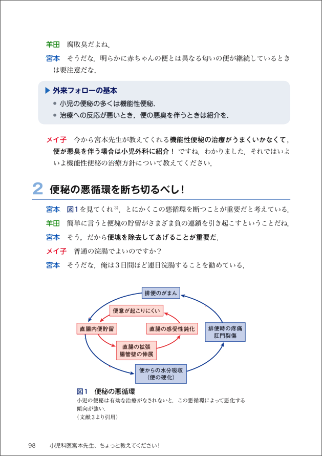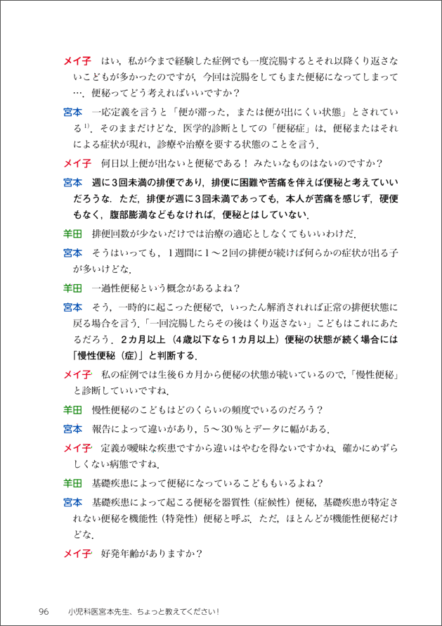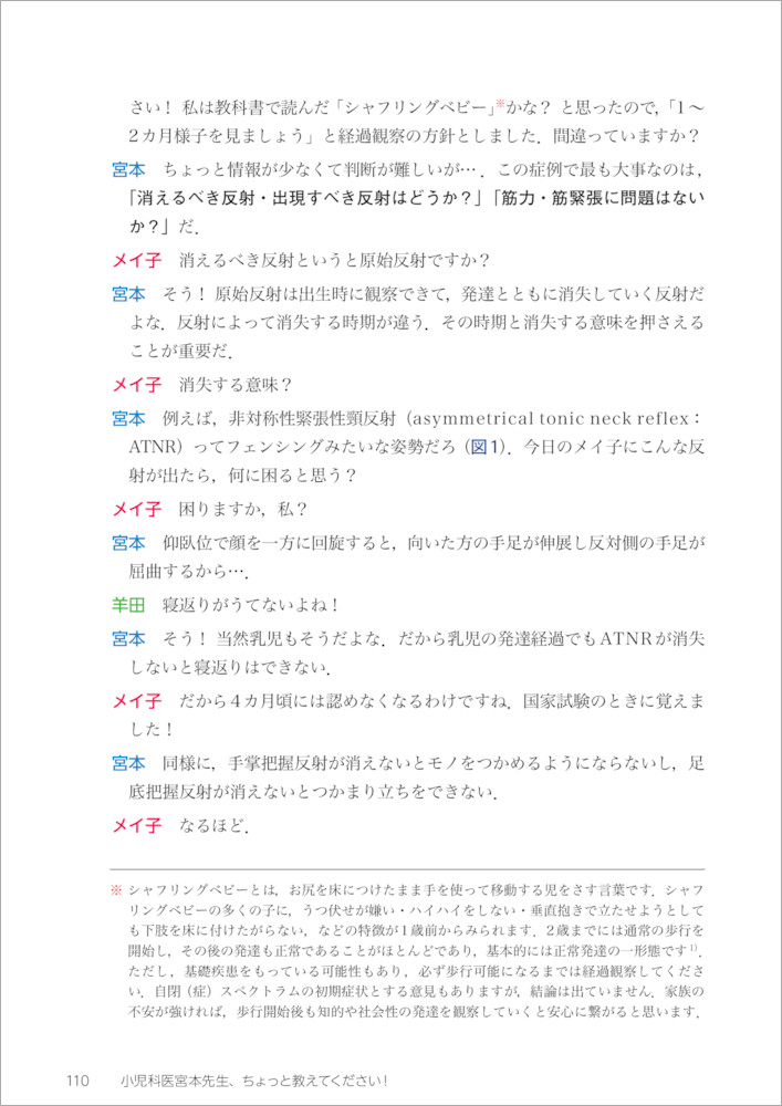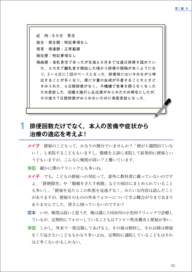奇をてらったようなタイトルだが, “ちょっと尋ねてみたい”小児診療での疑問がユーモアに富んだ対話の中で瞬く間に氷解する,表題通りのプライマリ・ケア医向け読本である.まず登場人物の構成が素晴らしい.大病院の小児科専門医に加えて,診療所の指導医クラスと若手の家庭医療専門医という,プライマリ・ケア医向けのスモールカンファレンスとして理想的な布陣となっている.ちなみにそれぞれ実在するモデルがおり,また執筆には若手からベテランの家庭医の先生も協力しているらしい.これらの登場人物が互いの特性を活かしつつ織りなすハーモニーが大変心地よく,そのせいなのか各章を読み終えた直後から,関連する問題で困っている子供たちを診たくなるのが不思議である.サブスペシャリスト監修にありがちな,プライマリ・ケア医がここまで知る必要あるの?などのマイナス感情が一切湧き上がらず,海馬に新しい知見がすーっとしみ込んでいくのだ.筆者のプライマリ・ケアに対する考え方が最終章に特別編として記してあり,なるほどと合点がいった.彼はプライマリ・ケア診療の特性を深く理解しており,それ故にテーマ毎のエッセンシャルミニマム伝授に成功しているのである.