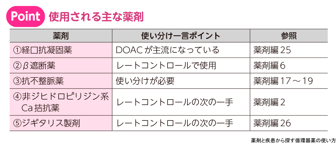 - 脳塞栓症の予防として抗凝固療法を行い,レートコントロール療法による症状の軽減を図る