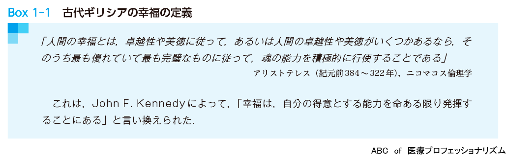 私たちは,皆,人間である.人間としてのあり方は,皆,同じである.すなわち,私たちは苦しみ,間違いを犯し,理想からかけ離れてしまうことがある.同様に,私たちは皆,偉大で優れた能力をもち,他人のニーズを自分自身より優先させることができる.私たち一人ひとりは唯一無二の存在であり,無視されることや奪い去られることが決してない価値がある.人生において私たちは,単に自分たちの時間をつぶすだけではなく,社会に参加して,自分に満足感をもたらす役割を果たすべきである.古代ギリシア人は,真の幸福を,卓越性に従い,自身の能力を十分に発揮することである,と定義していた(Box 1-1参照).これらの概念は,古代から支持されてきた.