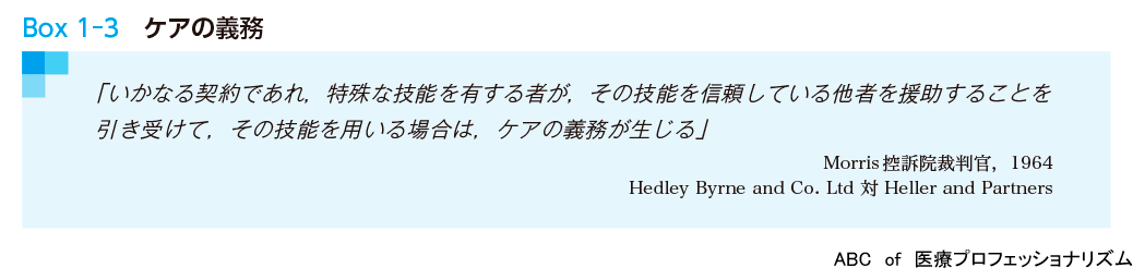 たとえ本当に患者中心であっても,このパートナーシップは依然として不平等となる可能性がある.患者は,専門家の知識と技能に頼り,それらを誠実に適用してくれると信頼するほかない.患者は,それを判断するのに十分な専門知識をもたない可能性があるため,医療専門家が正しいことを行うと信用するしかない.法律では,これは「ケアの義務」によって規定されている(Box 1-3参照).患者が医療を受ける手段と方法は個人と組織の両方によってコントロールされているため,両者とも患者に対するケアの義務を負う.