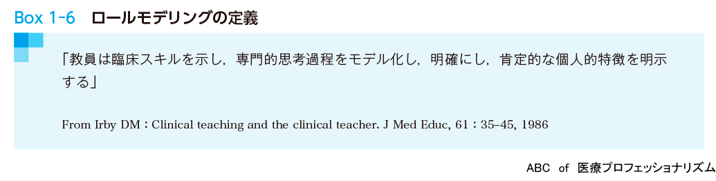 専門家としての価値観の獲得は,学生のトレーニング環境と,特に低学年で出会った医療従事者による影響を大きく受ける.ロールモデルは臨床教員であることが多い(Box 1-6参照).ロールモデリングは学生トレーニングの状況で言及されることが多いが,資格取得後にも当てはまり,学際的である.若い世代が誰かをロールモデルとするだけでなく,若い世代がロールモデルとなることもあり,また個人と組織の間でロールモデリングが行われる.