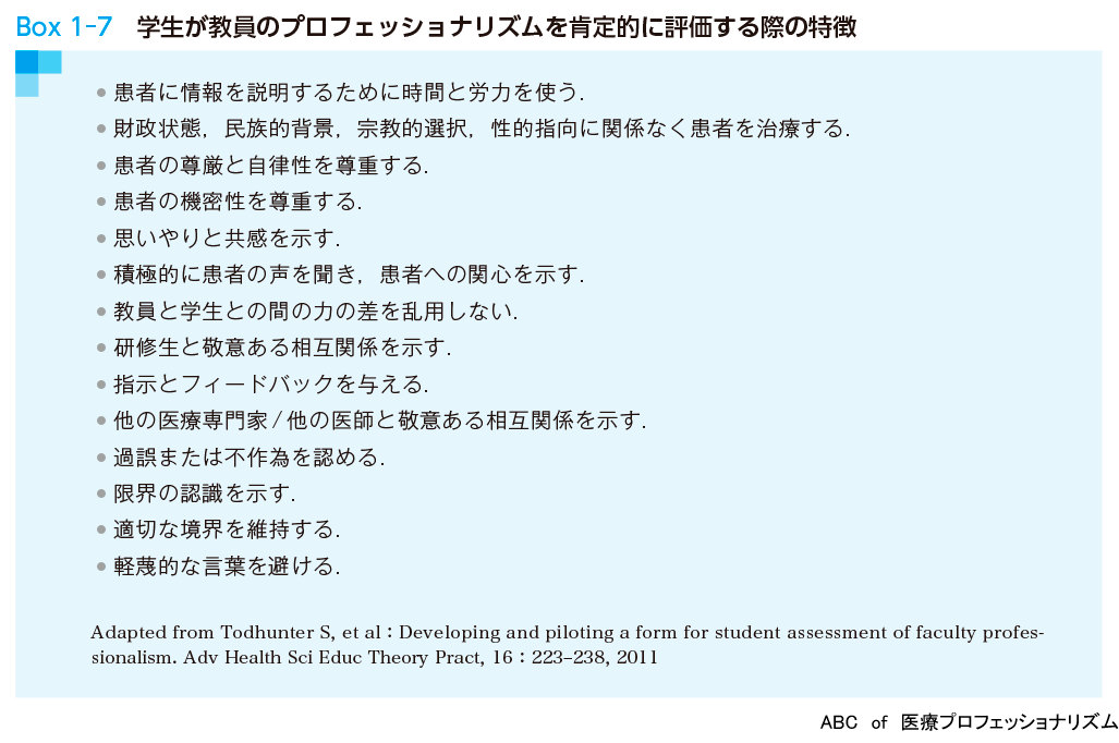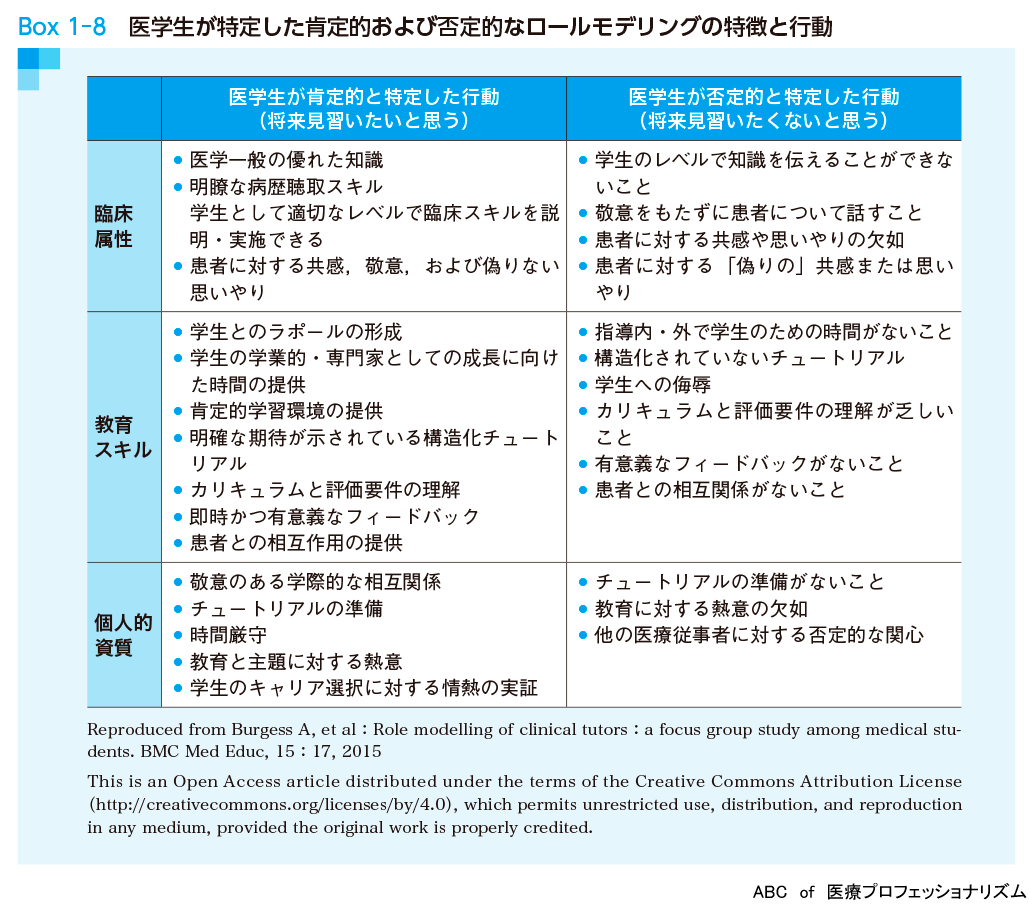 学生は,病棟で「利他主義,責任,正直さと誠実さ,敬意」を,また,教育/学習環境で「卓越性,リーダーシップ,および知識とスキル」が臨床教員から示されることを高く評価している(Karnieli-Miller O, et al:Which experiences in the hidden curriculum teach students about professionalism? Acad Med, 86:369-377, 2011).肯定的行動と否定的行動のどちらにおいても,臨床教員はロールモデルとなる(Box 1-7および1-8参照).