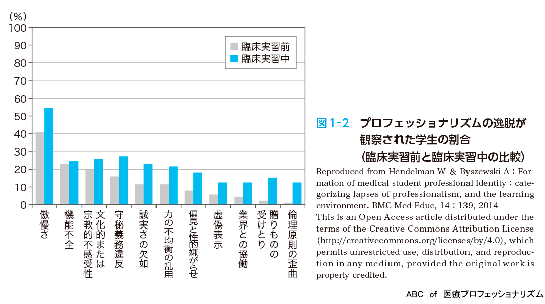 通常,学生は理想主義者としてトレーニングを開始する.公式・非公式な教育で学生が教えられることと,実際に起こっていることの観察の間に違いがある場合がある.これは特に,行動,態度,信念,および価値観(プロフェッショナリズムのすべての側面)に影響を及ぼす.学生は,教員やロールモデルの観察によって,自己の専門家としての行動を身につける.教員が言っていることと実際に行っていることが異なると,トレーニング中の学生の苦痛の大きな原因となる.したがってそれは,専門家としての行動の不適切な基準が,学生と臨床医との間に固定化してしまうことにつながる.
