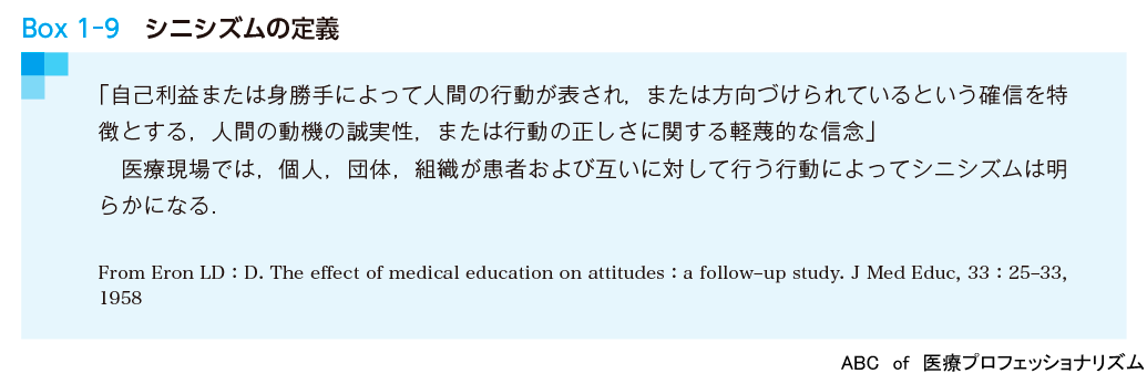 期待される行動の基準を遵守できない,または満たすことができないと「逸脱(lapse)」となる.個別的であるが逸脱の重要な事象は多くの理由によって発生し,継続的な個人的・専門的プロフェッショナリズムの形成には自己診断が必要であり,専門職集団全体の支援も必要である.学生は,履修課程のなかで逸脱を目にすることがある.逸脱を起こすのは,学生仲間や,臨床教員のこともあるし,事務スタッフの場合もある(図1-2参照).その結果,理想が侵食され,トレーニングと医療に関するシニシズム(冷笑主義)が増大する(Box 1-9参照).このシニシズムは,トレーニングの最初の1年以内にはじまり,医学領域では臨床1年目(通常3年次)の間に加速する.そして,専門職集団のなかで年長者として理想的状態に近づいていく前に,実際に診療をはじめた早期にシニシズムはさらに深まっていく.