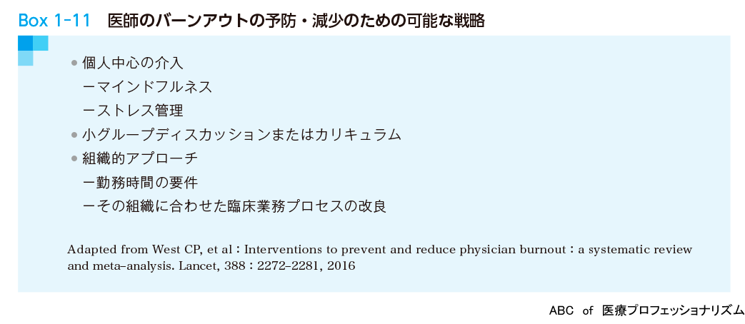 ウェルビーイングとレジリエンス(回復力)は,単にバーンアウトと自殺念慮がないことではなく,「自分の得意とする能力を,命のある限り最大限に発揮すること」,すなわち,患者のケアを安全に,成功裏に行うことである.家族の機能を果たしていない家庭の両親が子どもたちに落ち着くように指示できないのと同様に,レジリエンスを強制することはできない.しかしながら,私たちは,個人,同僚,リーダーとして,患者,専門家に対するやり方と同様に,レジリエンスを促し,サポートすることはできる.バーンアウトを減らすための介入についてのWestの系統的レビューでも限られた数の戦略しか特定されなかった.しかし,成功した介入は個人中心と系統的・組織的の両方であることは明らかであり(Box 1-11参照),このことは,医療専門家は組織に従うだけの存在ではなく,組織と同等のパートナーとして働くべきであることを意味している.